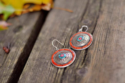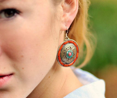Great modern style sterling silver earrings with fine filagree work and inlaid with coral and turquoise. Handmade in Nepal.