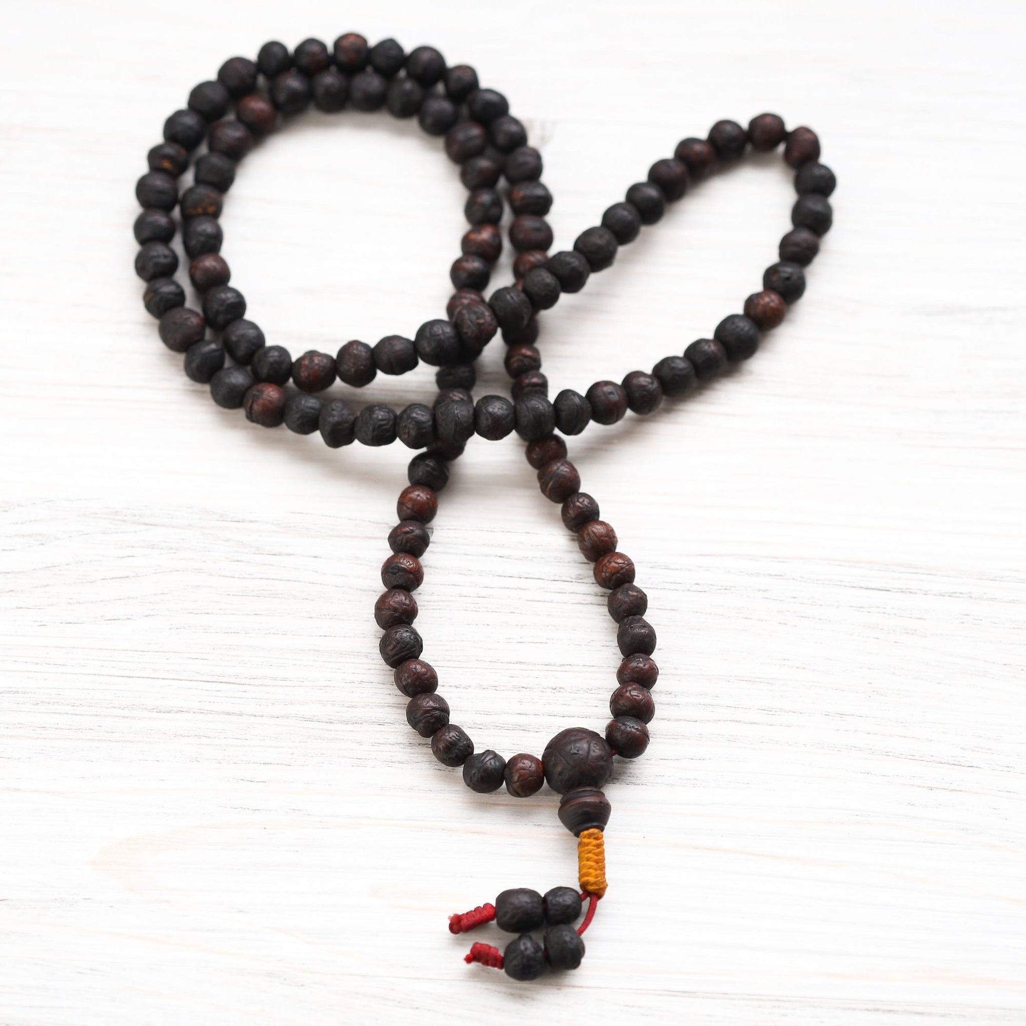 From our DharmaShop curated collection, this mala was hand selected from an antique Bodhi Seed seller just outside of the Boudhanath temple. Here you can see monks from nearby monasteries meditating with similar mala beads.