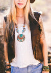 Stunningly beautiful, this amazing Tibetan necklace contains large pieces of turquoise, coral, and amber. Accented with silver peaces and smaller beads. Handmade in Nepal by Tibetan artists.
