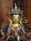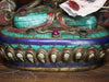 Each statue is made by hand using the lost wax method, which takes considerable time and skill.  After bronze casting, each statue is hand detailed and carved by master craftsmen.  The turquoise and coral mosaic, as well as the faceted jewel inlay work, takes several artisans over a month long process to create.  The face and neck of the statue is then gilt with 24k gold.