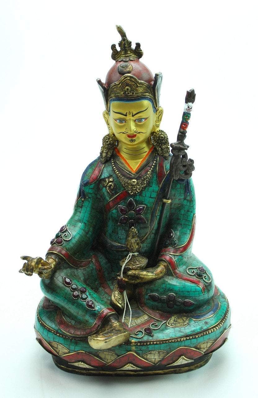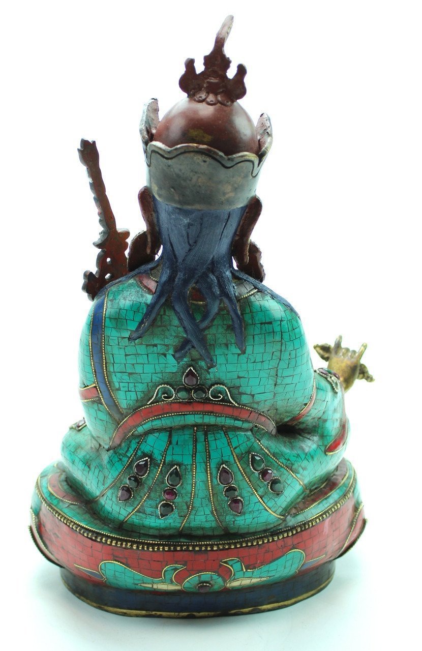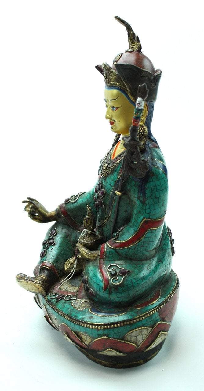 Padmasambhava is also known as Guru Rinpoche. Lost wax casted bronze. Hand tiled mosiac with jewels. Gold painted face. Made in Nepal.