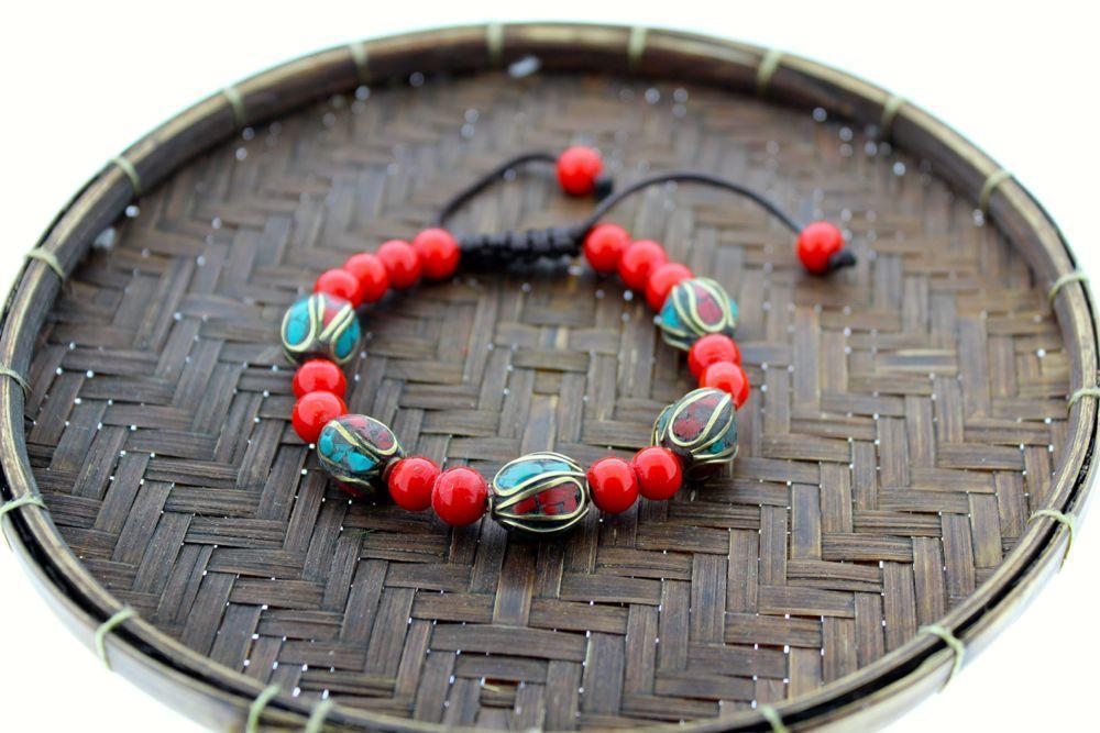 The traditional Tibetan beads are inlaid with coral, turquoise, and brass.