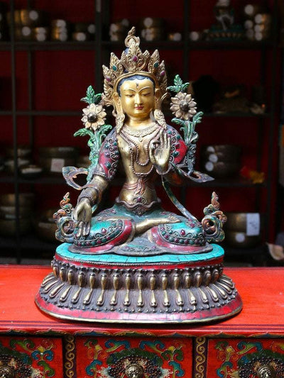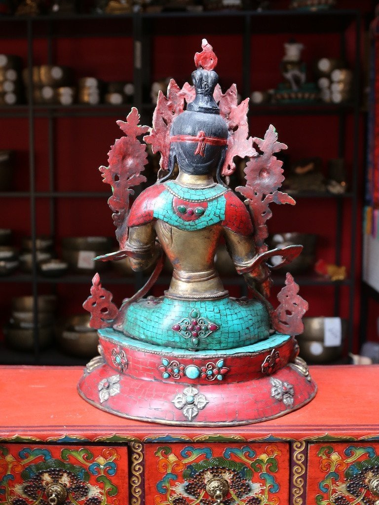 This statue is just in from Nepal. I have been looking at images of it for months and I had to have it shipped from our statue makers. This 20 inch tall bronze statue is made by hand using the lost wax method. This statue is then hand detailed with turquoise and coral inlay work and faceted jewels are placed that takes severel artisans during the month long process to create. The statue is then gilt with 24k gold on all areas not inlaid with gemstones.