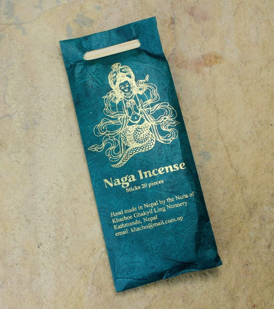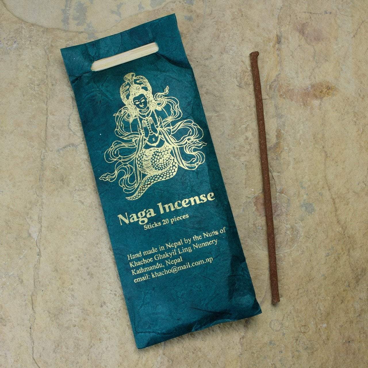 This Naga incense represents the serpent dieties which have excessive strength, offer protection, and guard against harmful energies. Handmade by the nuns of Khachoe Ghakyil Ling Nunnery in Kathmandu, Nepal.