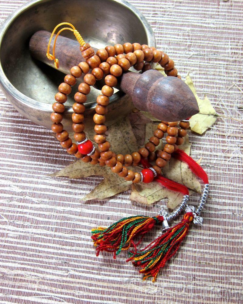 I love this simple and beautiful mala. 108 natural wood beads, two counters and 3 stone spacers. Handmade in Nepal