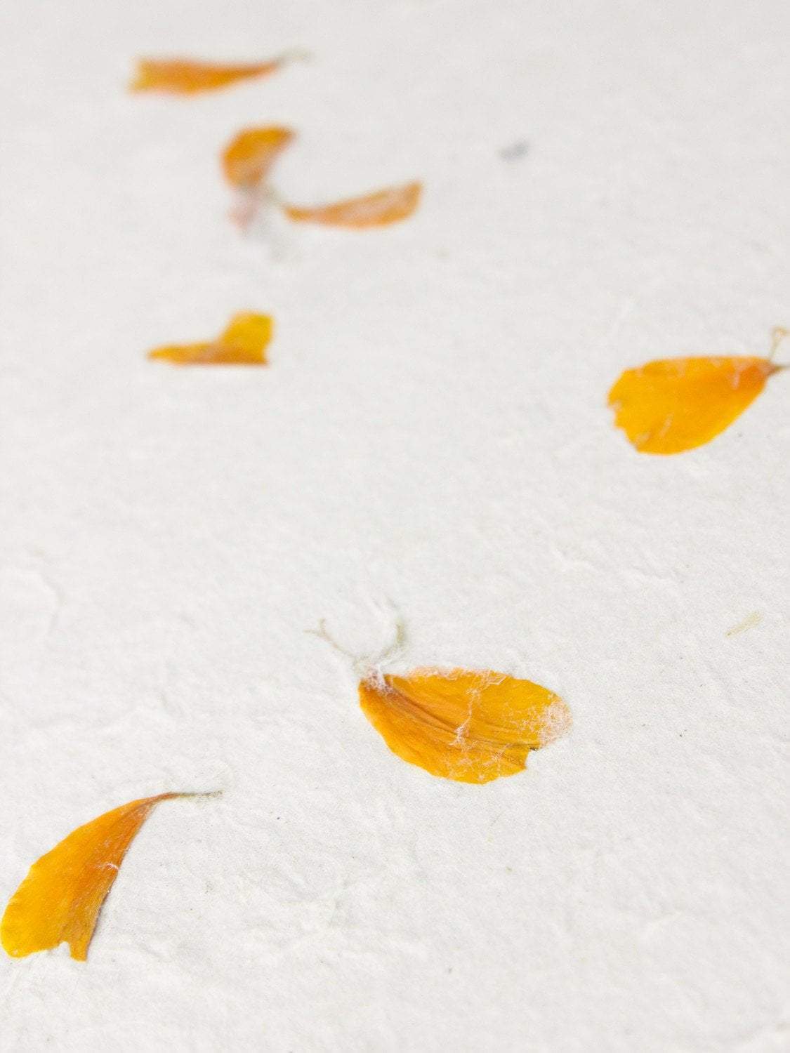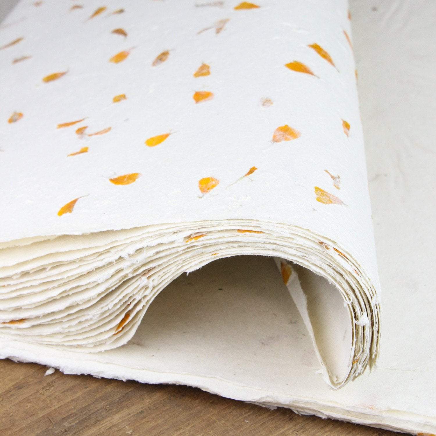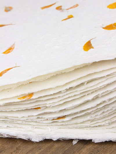 These are recycled Nepalese Lokta Paper Sheets that have been dyed using natural vegetable and mineral pigment colors, with Marigold flower petals pressed into each sheet. The Marigold is associated with the sun - being vibrant yellow and gold in color. Theflowers open when the sun is out. It is also called the “herb of the sun," representing passion and creativity. This paper is perfect for wrapping gifts or for other paper crafts.