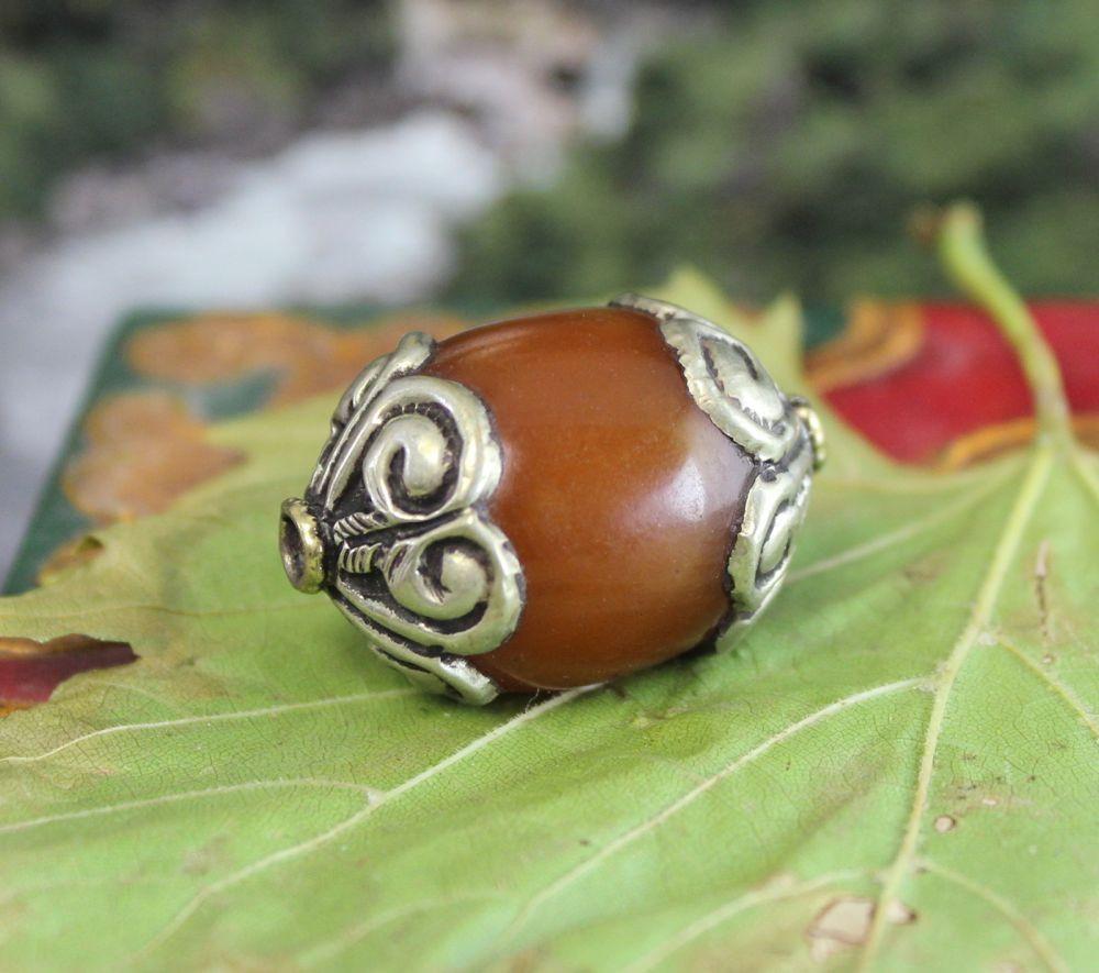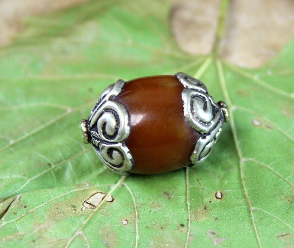 Copal is new amber, tree sap hardened to create beads of any color. This natural resin bead is silver capped by Tibetan artisans