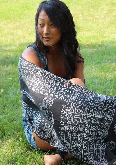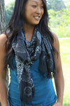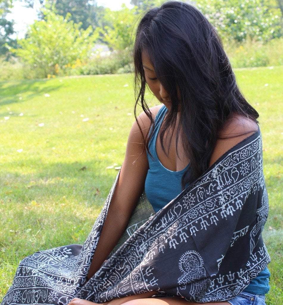 This awesome, black Om prayer scarf is elegantly finished with hand tied tasseled ends. Super soft cotton that has been vegetable dyed with hand printed Om designs. This beautiful prayer shawl is large enough for quiet, seated meditation.