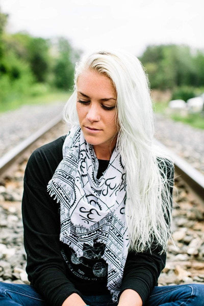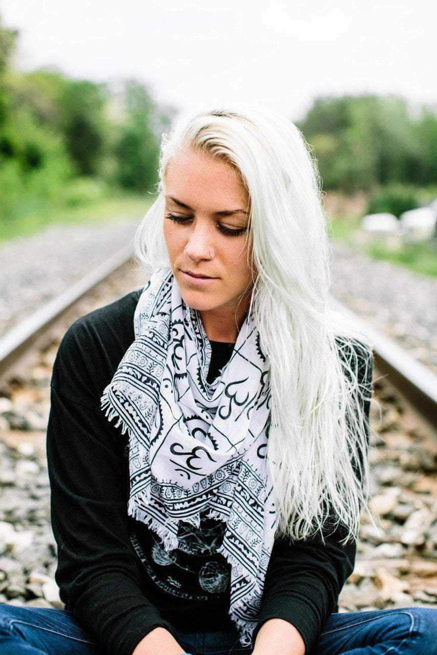Our new white Om design scarf is 100% cotton. A perfect lightweight scarf for the spring and fall!