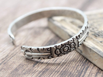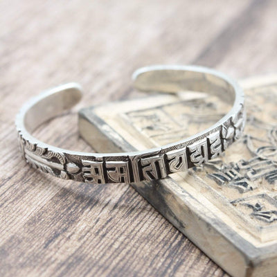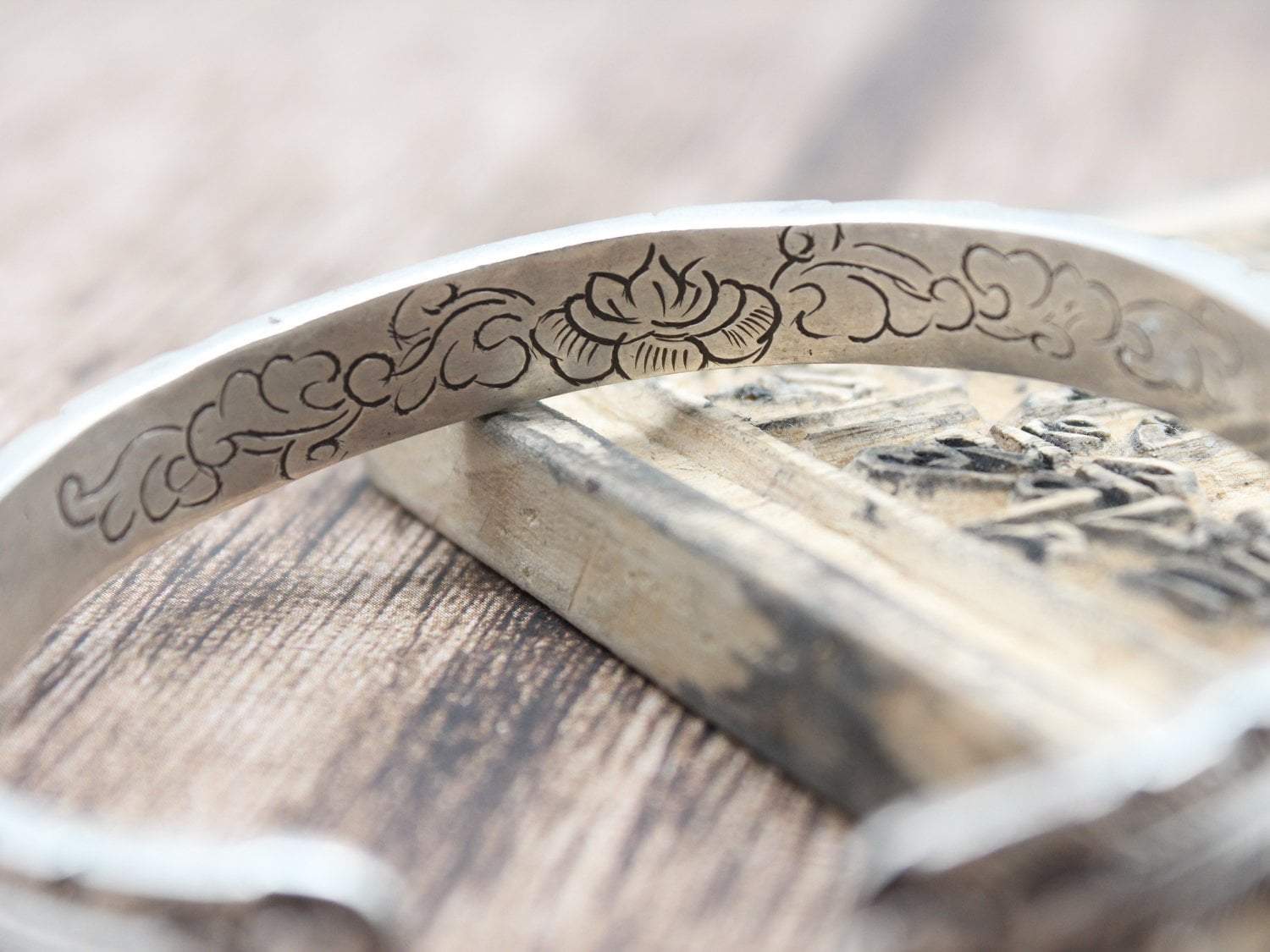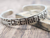 It is very rare that we are able to come across mantra bracelets with Newar script - so we are very excited about this one! Only two available! This hand carved solid silver cuff bracelet features the compassion mantra, Om Mani Padme Hum, written in Newar script. It also has incredible floral details on either side of the mantra and a lotus design etched inside the cuff.