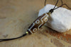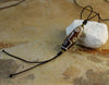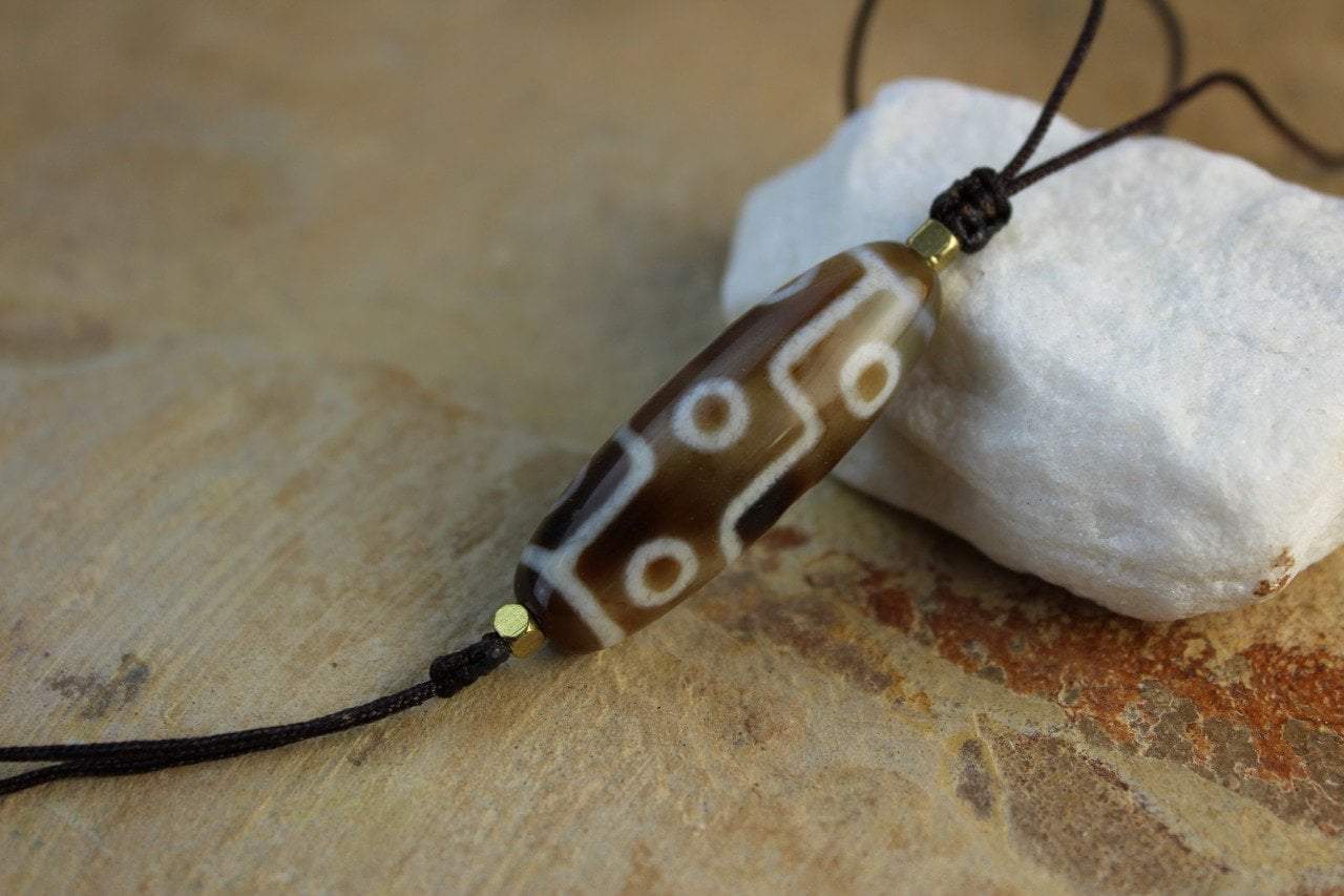 9-eyed dzi bead hung vertically on dark brown cord with hand made beads. A double sliding knot design at the top and bottom of the bead, makes this necklace uniquely adjustable. The nine eye Dzi bead is said to promote wealth, good health, suzzess, compassion and glory.