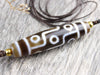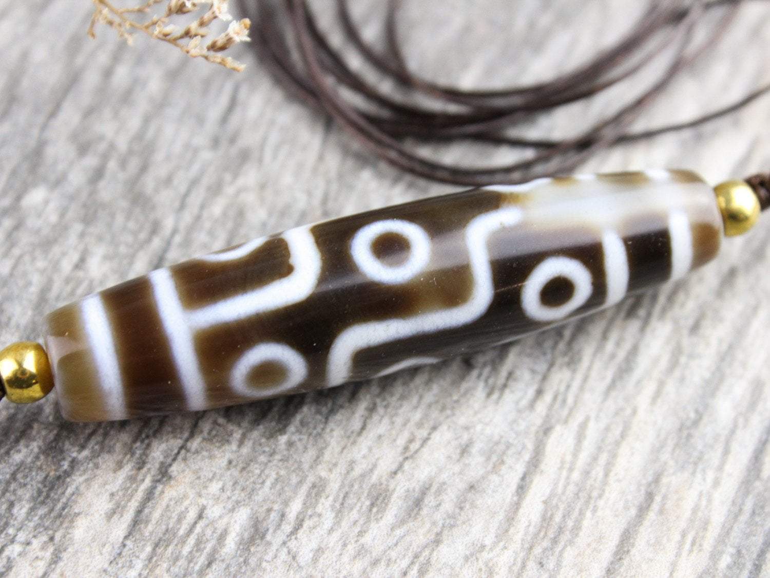 Each of our Dzi bead necklaces are hand strung right here at the DharmaShop with true agate modern Tibetan Dzi beads collected in the last 17 yearsfrom Kathmandu, Nepal. This necklace features a nine eyed Dzi with brass accent beads on brown vegan leather cord. Adjustable sliding knots at either end of the Dzi allow for an easily adjustable necklace length.