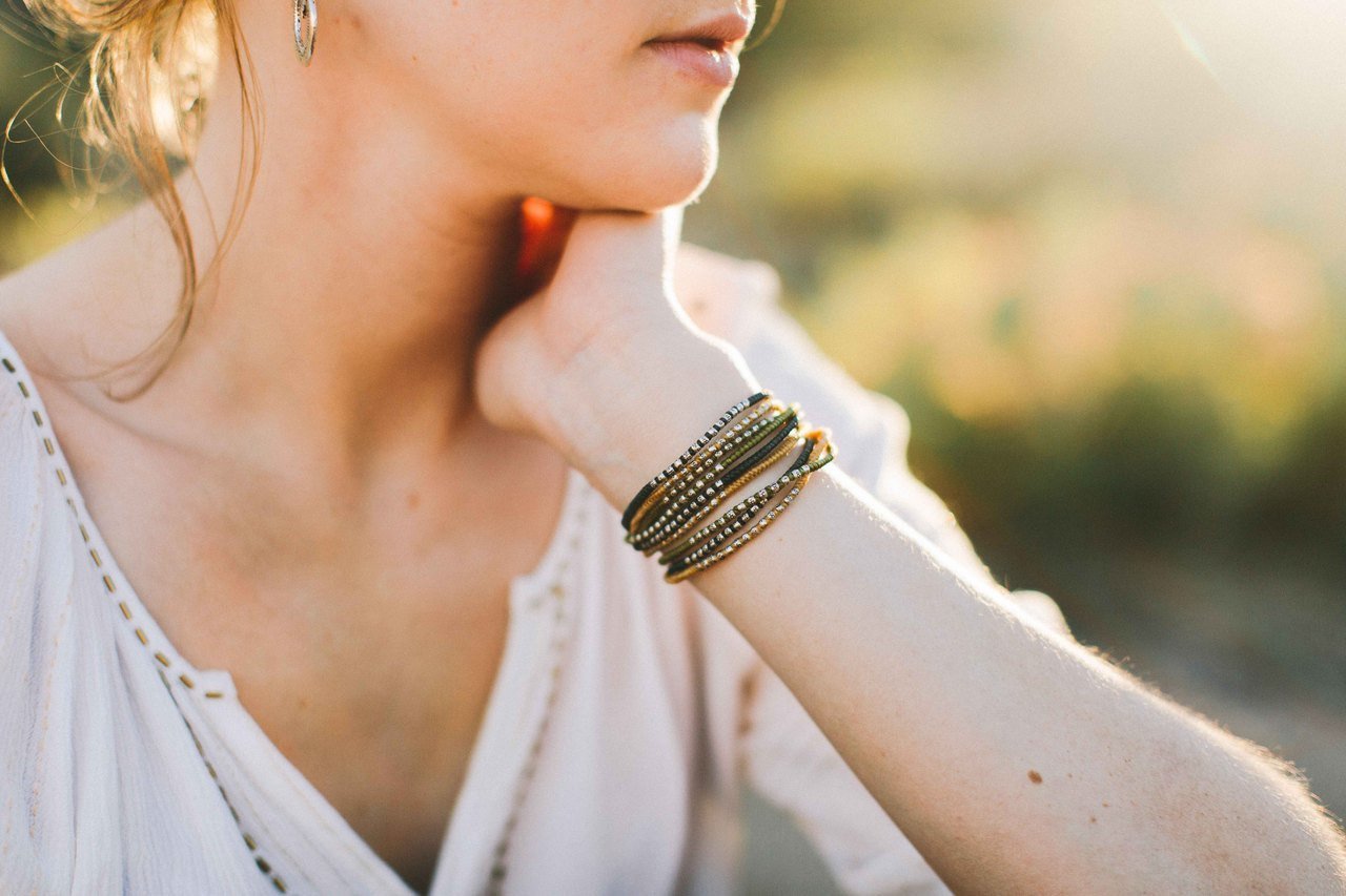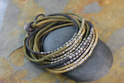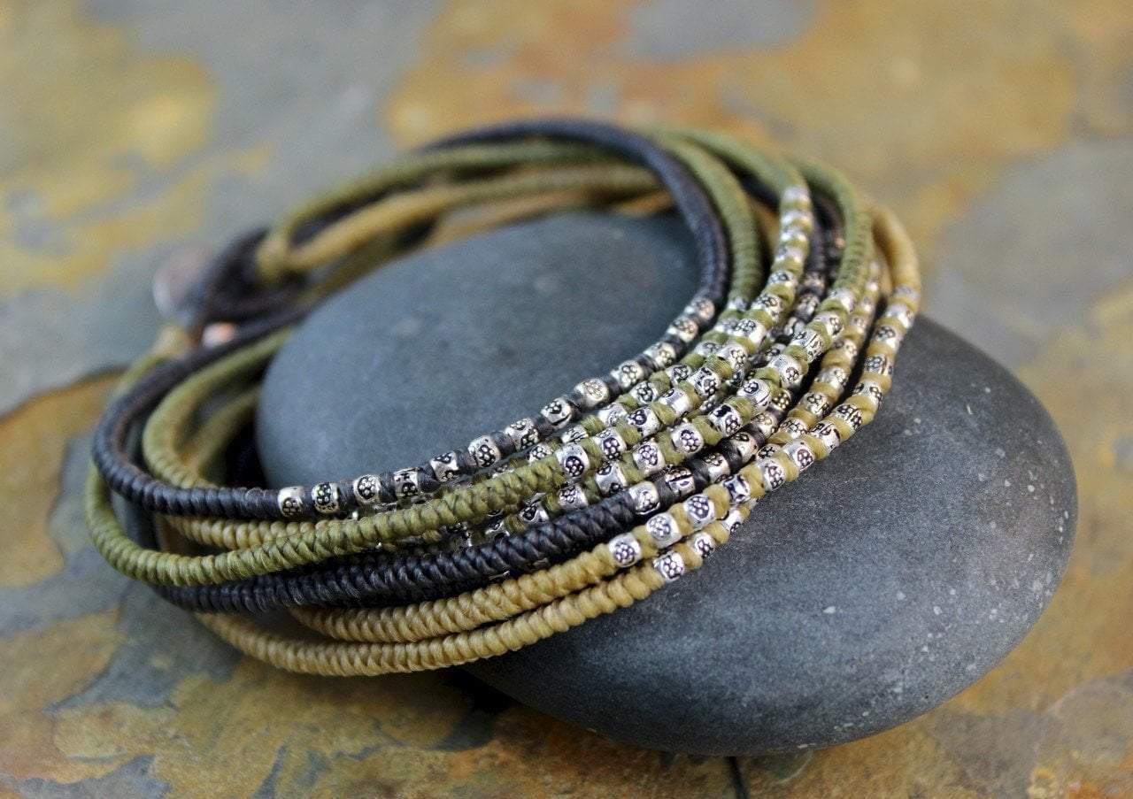 Nine layer wrap bracelet. Black and olive combination of colors made on wax cord. Hill Tribe silver throughout wrap. Silver end to easily secure wrap. 100% sourced and made in Thailand. A great solid piece to add to your collection. Can also be worn as a necklace.