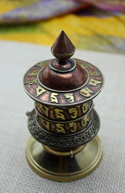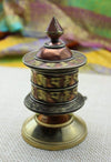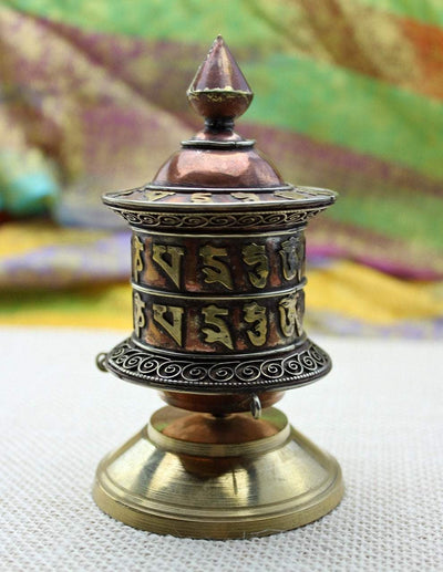 Hand made in Nepal. Temples in Nepal and Tibet have hundreds of these similar hand carved prayer wheels in bigger form. They are turned clockwise and contain prayers inside the wheel to multiply the prayers with each turn. This prayer wheel has the mantra of compassion written in the tribal Nepal language of Newar.