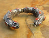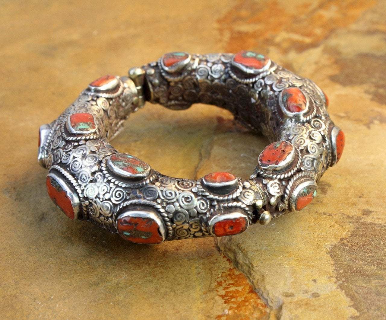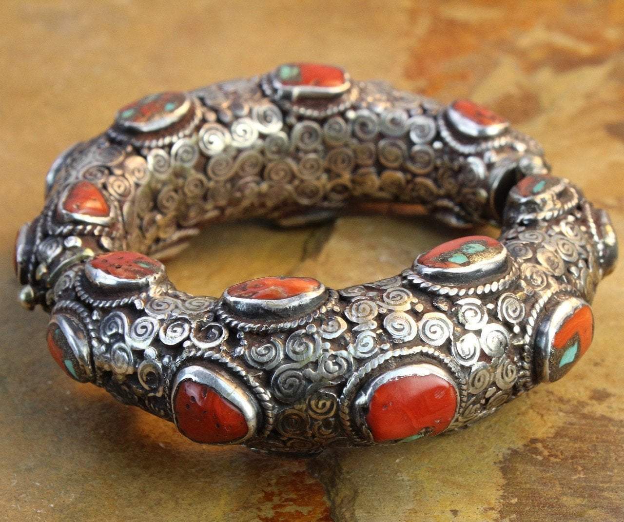 We acquired this eye-catching piece over 10 years ago while in Nepal. This hinged bracelet is made out of sterling silver with hand done filagree work and antique coral stones.
