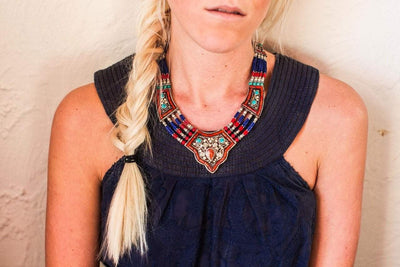 Hand made in Kathmandu Nepal. Turquoise beaded necklace with large Turquoise and coral inlaid pendant.