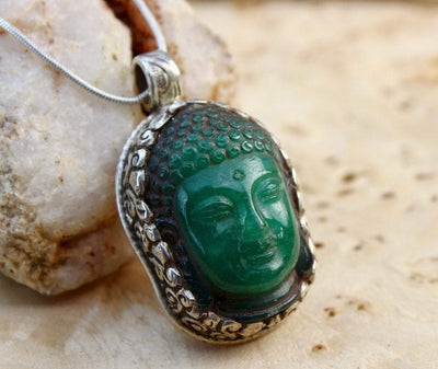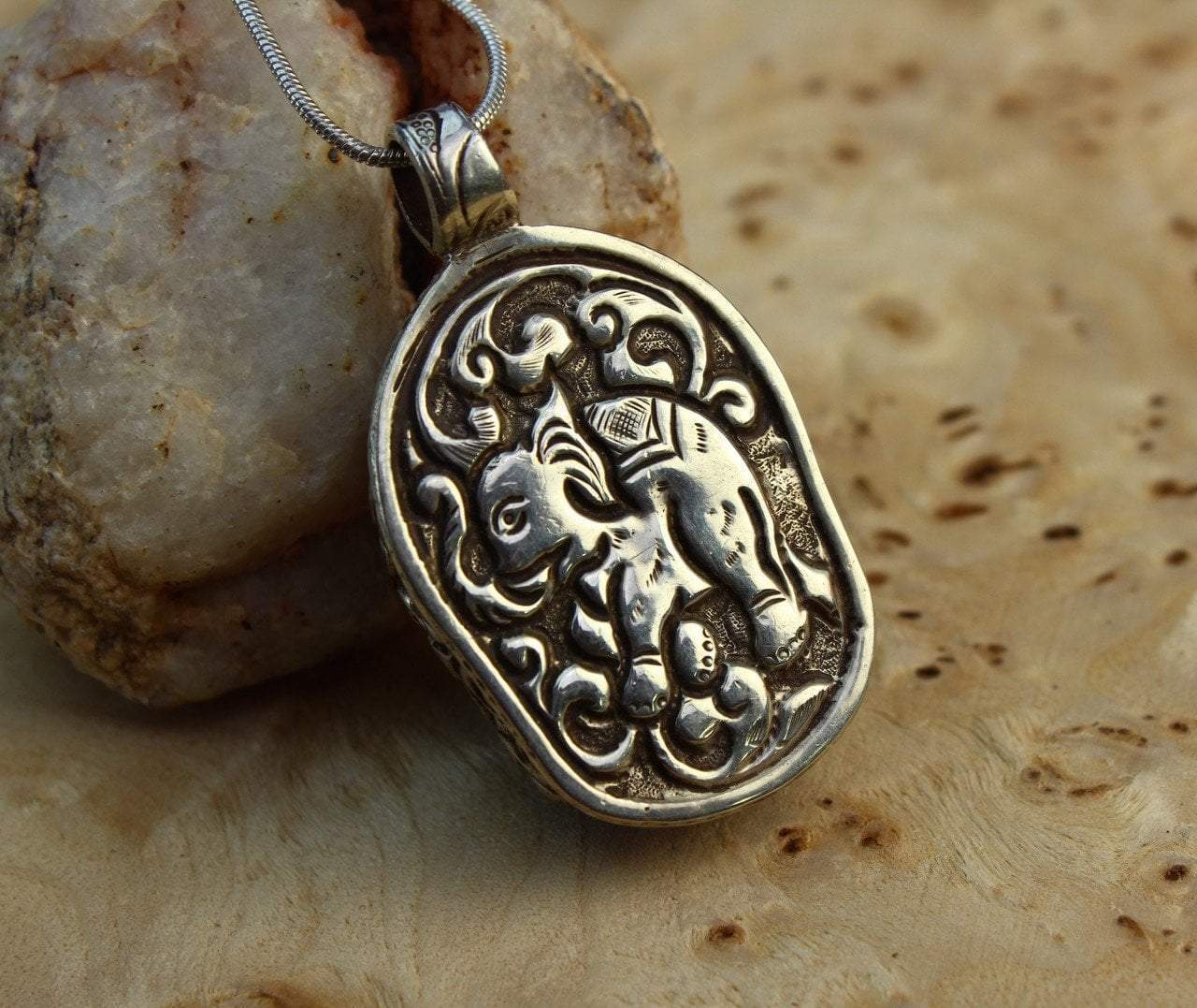 Elegant cast Buddha head with serene meditative expression is set in sterling silver with sterling bail. Intricate hand rope-work decorates the sides of setting as well as an elehant on the back. Handmade in Nepal.