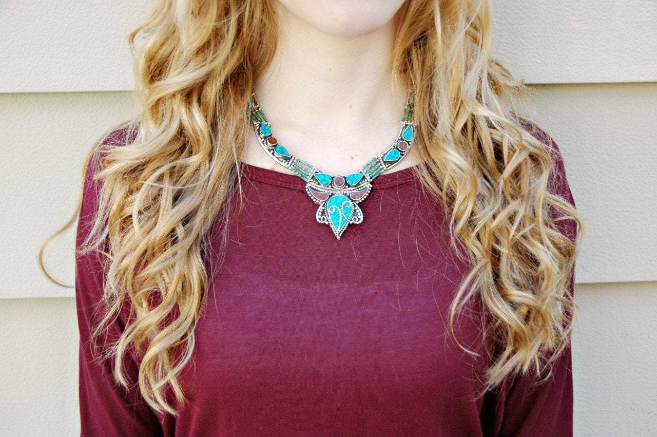 Hand made in Kathmandu Nepal. One of a kind turquoise and amber necklace. 18 inches around.