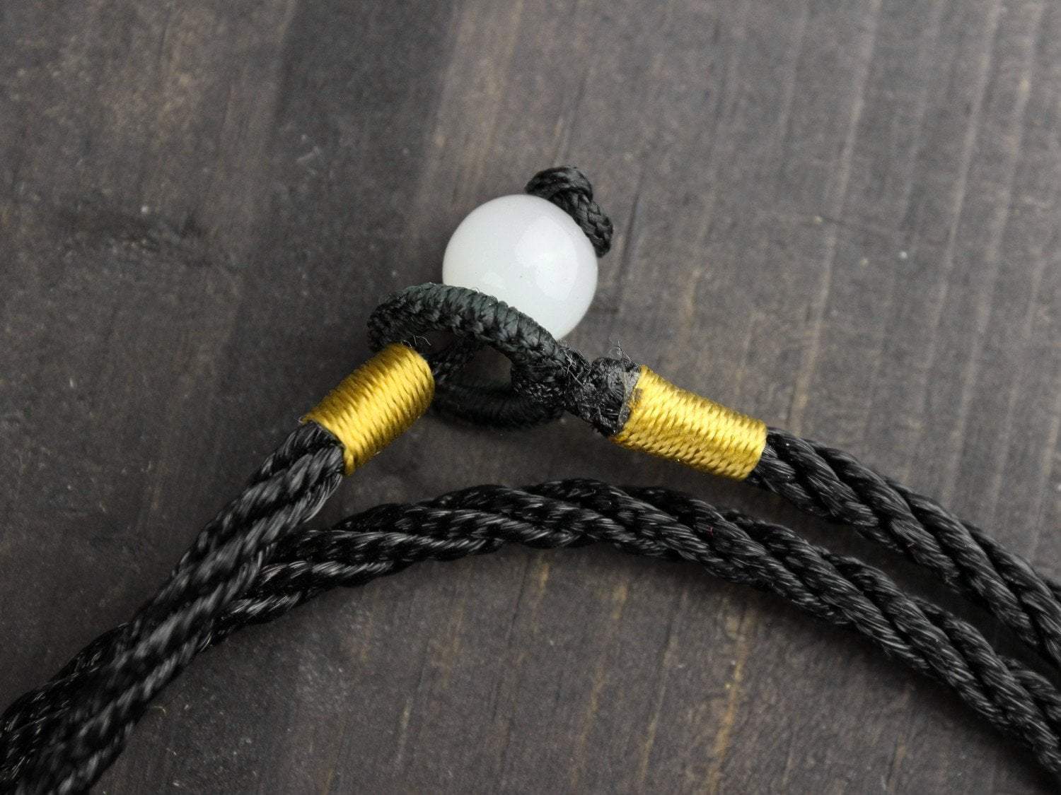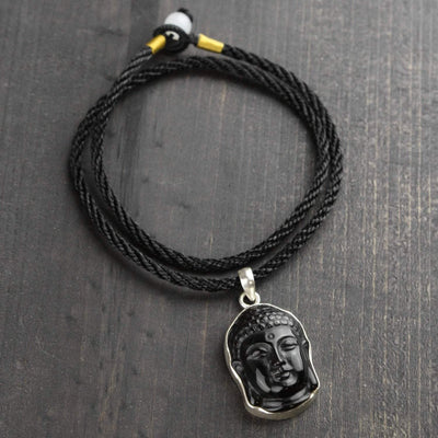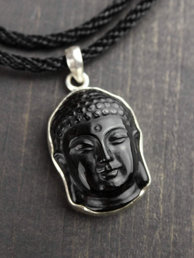 DharmaShop exclusive necklace features a beautiful Buddha pendant made with a hand carved onyx gemstone that has been placed into a sterling silver setting with sterling bail. The pendant is hand strung on black woven nylon cord with a knot and snow quartz bead closure.