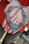 Hand made in Kathmandu Nepal. 18 inches around, focal bead is 3 by 2 inches