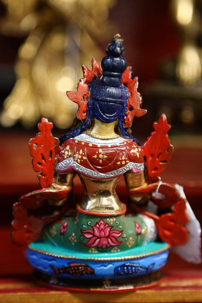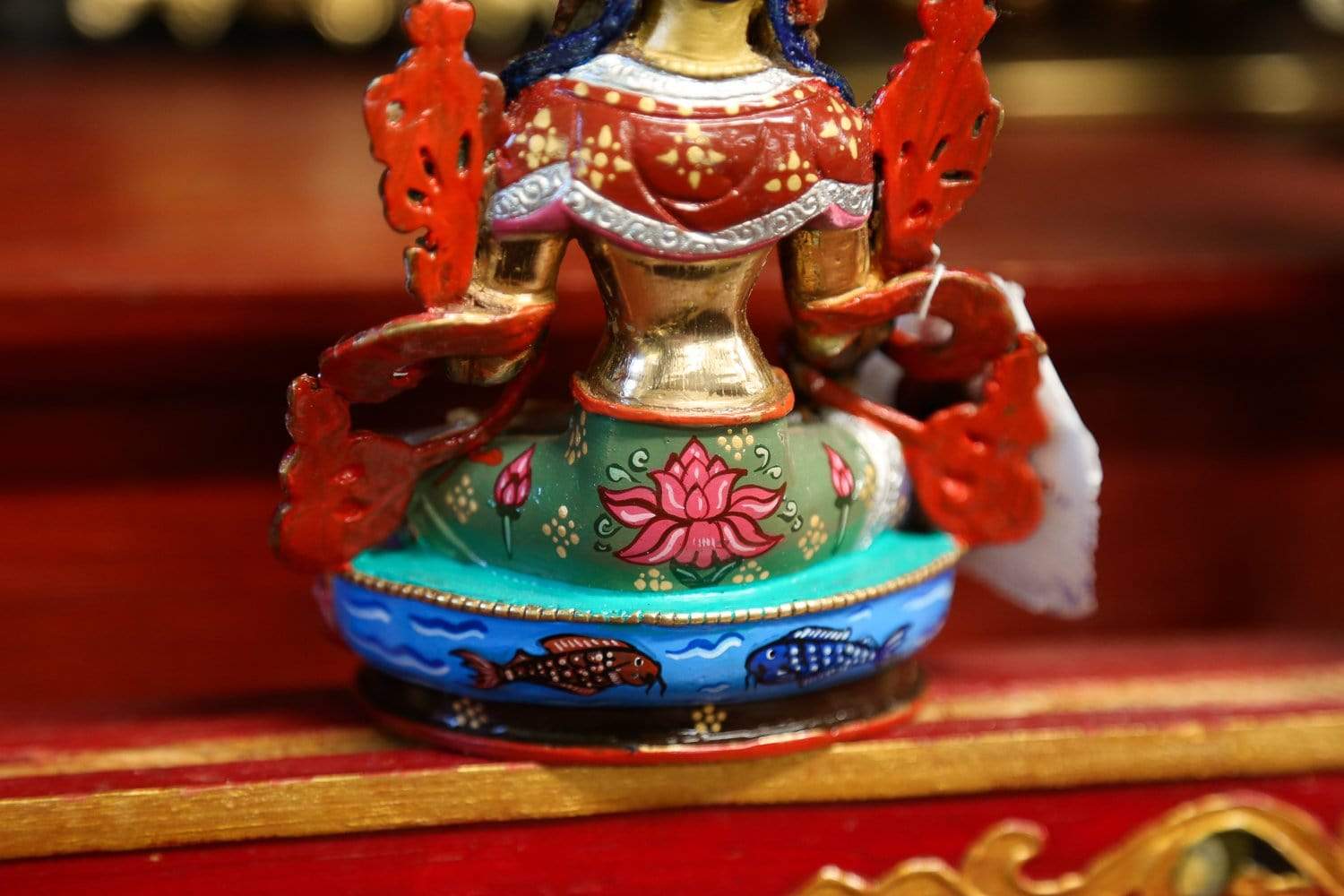 Each statue is full of colorful painted detail including swimming fish on the base and a lotus flower on the back. The two fish represent fearlessness. Living without dabger of drowning in the ocean of sufferings, just as fish swim freely without fear through water. The lotus flower, in many cultures, represents purity and peace, blooming through the mud.
