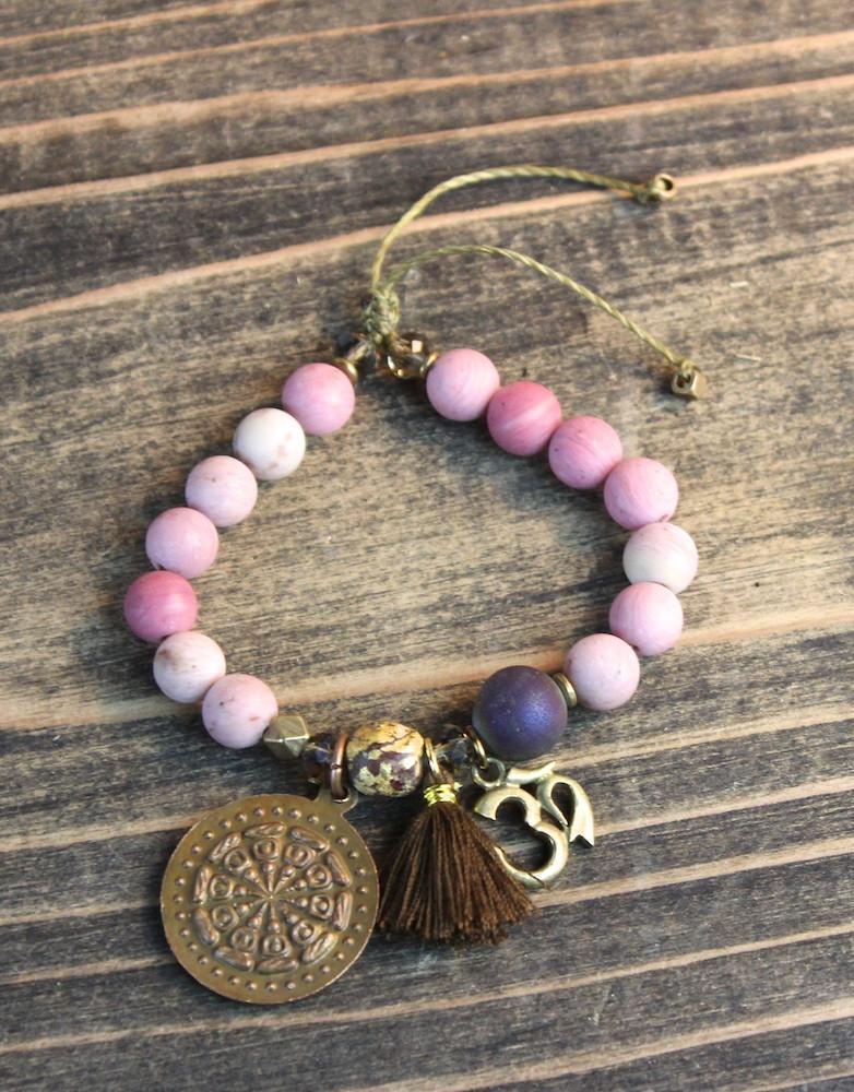 Pink matte agate beads with copper om pendant, purple druzy bead, brown tassel, gold leaf Buddha bead, large bronze Thai Buddha Amulet, smoky quartz accent beads and copper accent beads. Pull cord to tighten around your wrist.