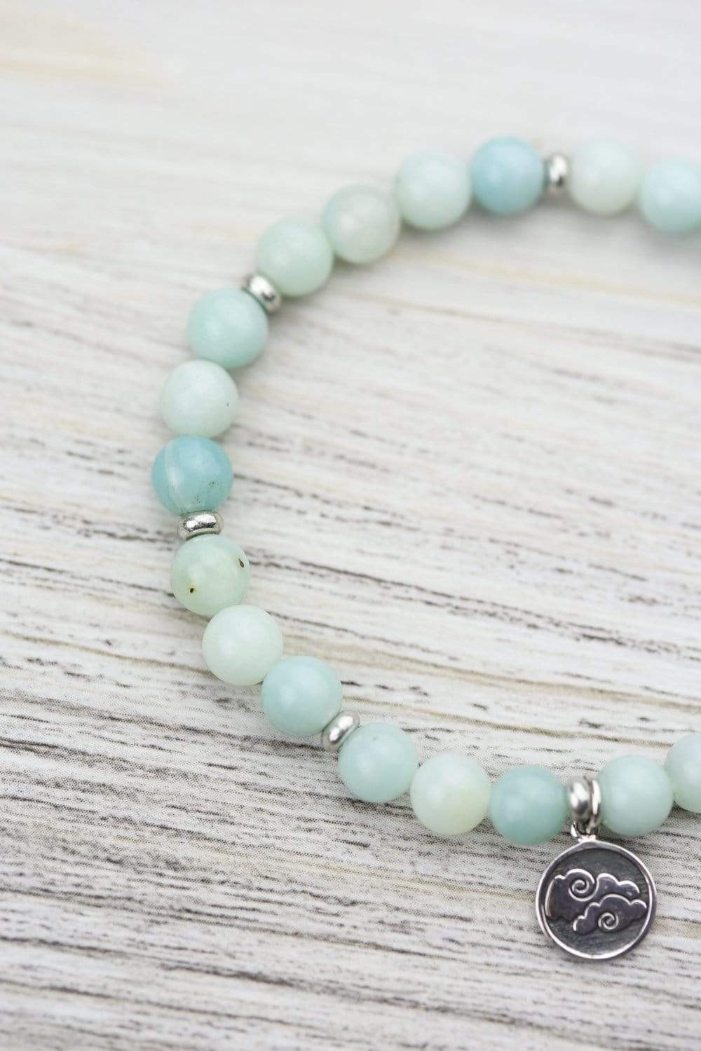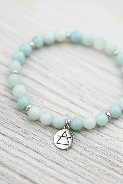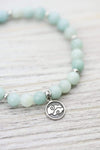 • This bracelet is hand strung in Michigan at the DharmaShop with beautiful sky blue Amazonite beads from Brazil and a sterling silver charm with two sides.