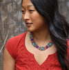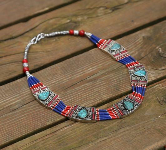 Hundreds of delicate lapis and red glass beads are strung together with the larger silver-plated turquoise inlaid central medallions on this beautiful traditional piece.