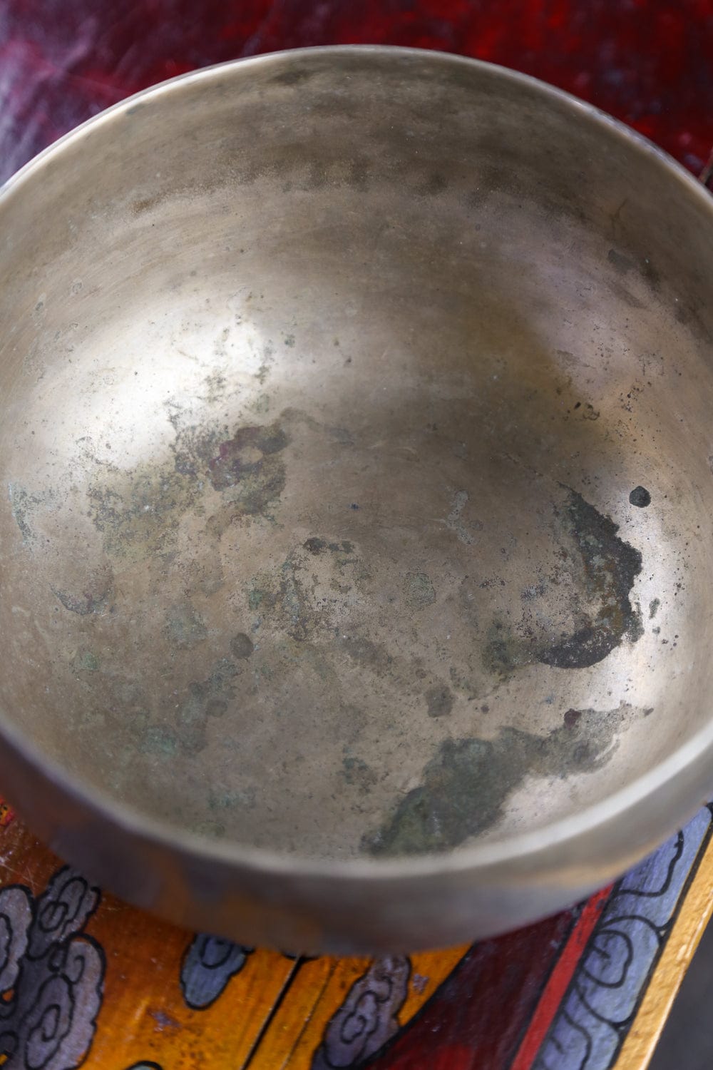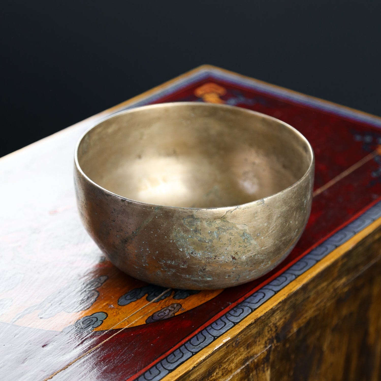 • This is a medium sized, beautifully aged, singing bowl with thick walls for a deeply resonating tone.  Truly a one-of-a-kind bowl with gorgeous signs of age and wear including natural patina.