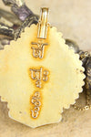 Measures approximately 2 1/4 inches tall and 1 3/4 inches wide.  Also includes gold chain that measures 18 inches around.  Made in Nepal.
