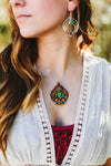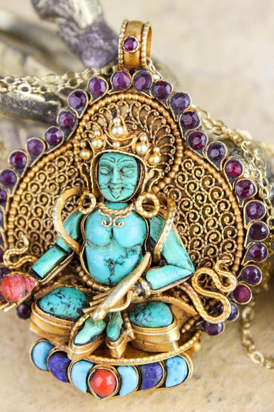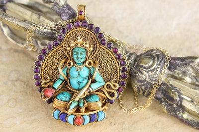 Exceptionally detailed, one-of-a-kind Thai Vermeil pendant that is handmade by artisans in Nepal.  Pendant features a hand carved pure turquoise Buddha and is garnished with ruby gems and coral.  Absolutely no detailed was spared when making this piece and it certainly does not go unnoticed.  Hand stamped traditional Thai symbols are included on the back of the pendant.