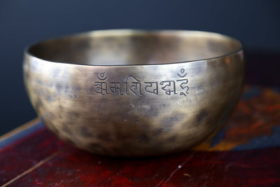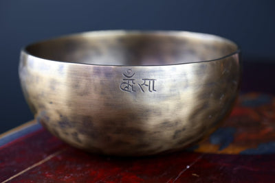Each bowl features gorgeous hand carved details including an exclusive Full Moon Singing Bowl stamp, an original makers mark, and the mantra of compassion in Tibetan script.
