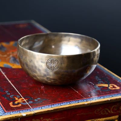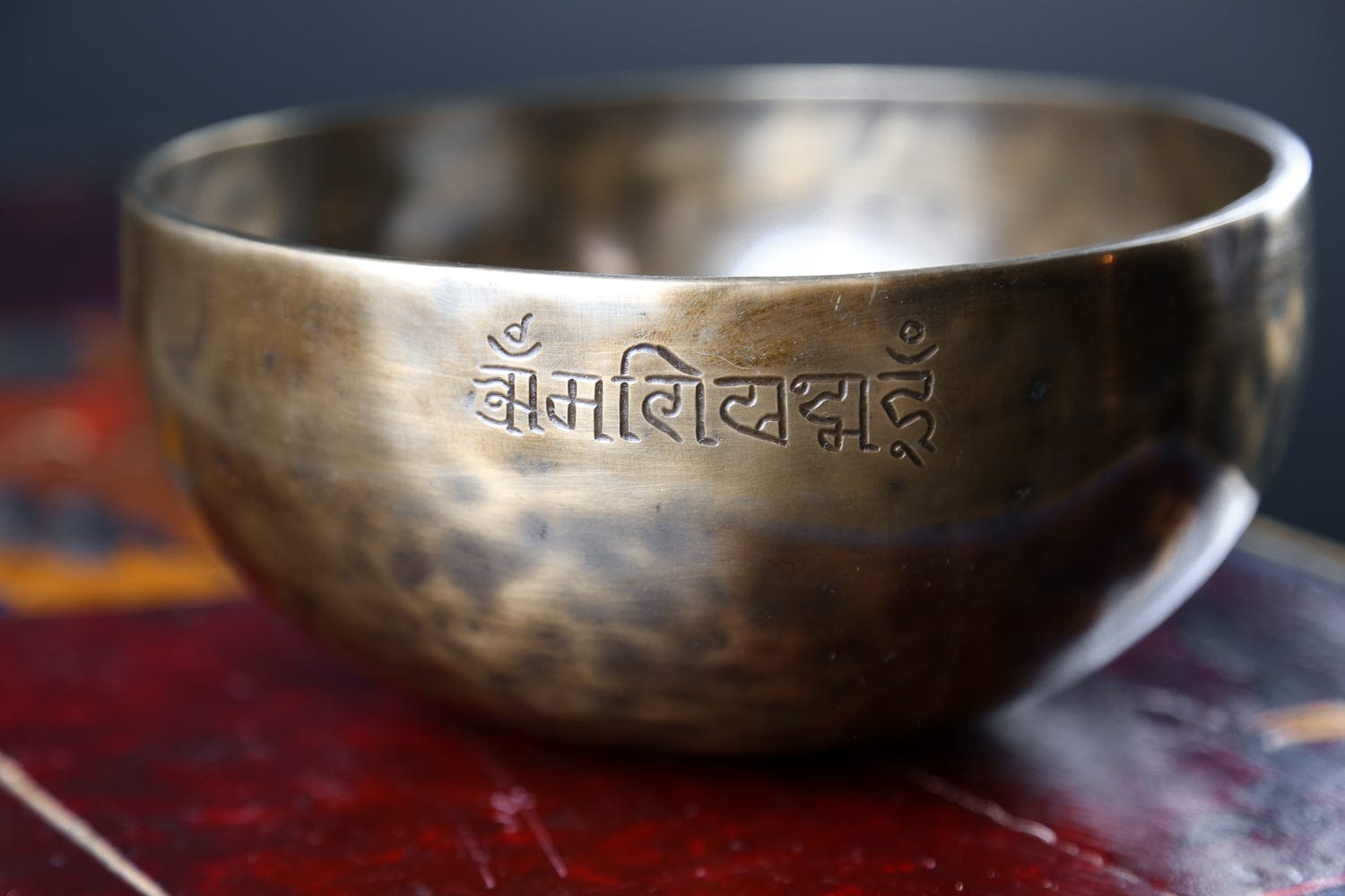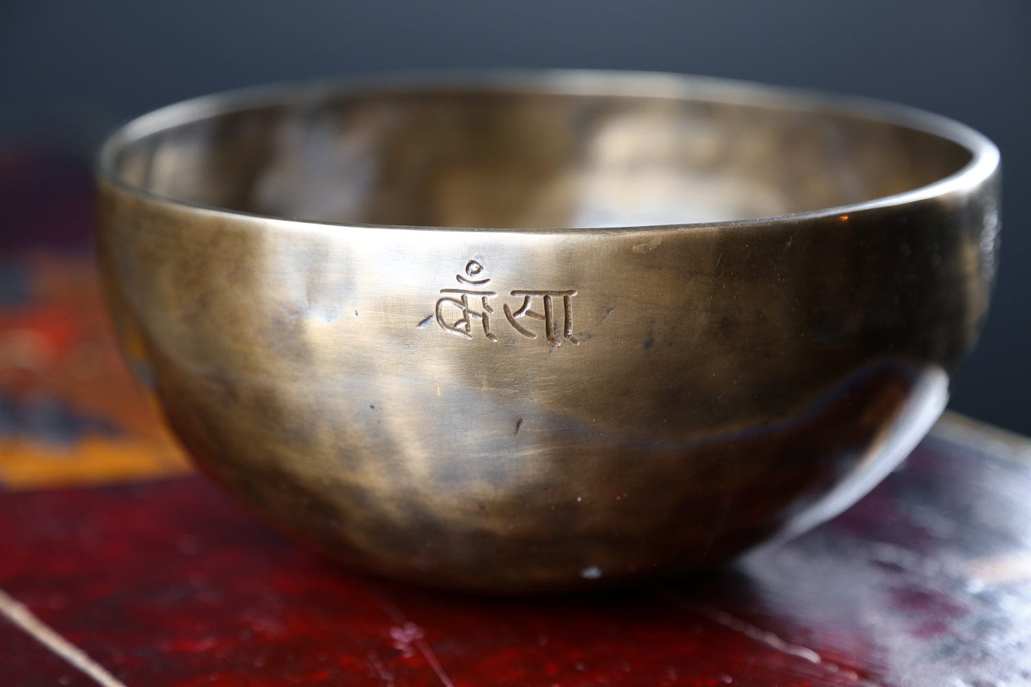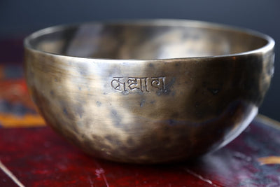 Each bowl features gorgeous hand carved details including an exclusive Full Moon Singing Bowl stamp, an original makers mark, and the mantra of compassion in Tibetan script.