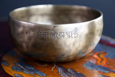 Each bowl features gorgeous hand carved details including an exclusive Full Moon Singing Bowl stamp, an original makers mark, and the mantra of compassion in Tibetan script.