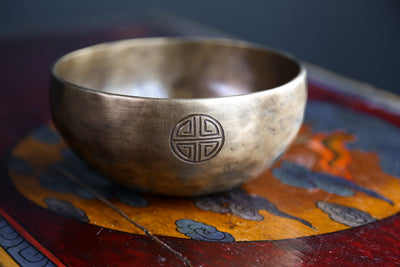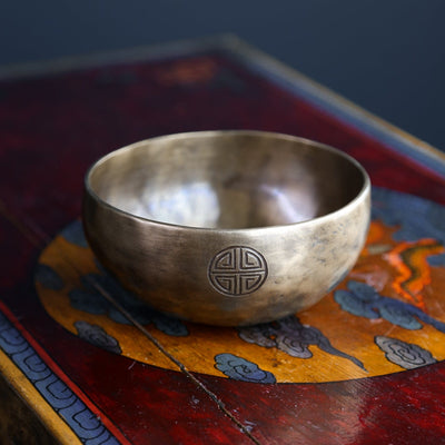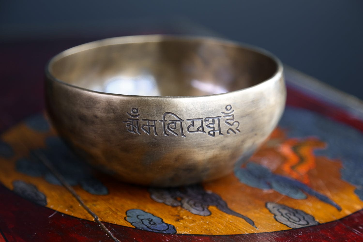 Each bowl features gorgeous hand carved details including an exclusive Full Moon Singing Bowl stamp and the mantra of compassion in Tibetan script.