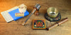 Size:Box itself measures approx 7 inches long and 4 1/2 inches wide. Prayer wheel measures 6 /12 inches long, prayer wheel stand measures approx 2 inches tall, singing bowl measures 2 1/2 inches. Striker (after assembeled,) measures approx 5 7/8 inches long, singing bowl cushion measures approx 3 1/2 inches around, stamp is 2 inches long and 7 /8 of an inch thick, wood buddha picture approx 2 7/8 circumference, ink pad measures approx 4 x 3 inches.
