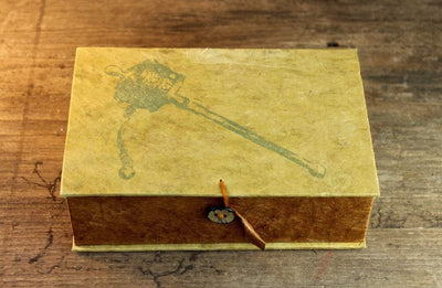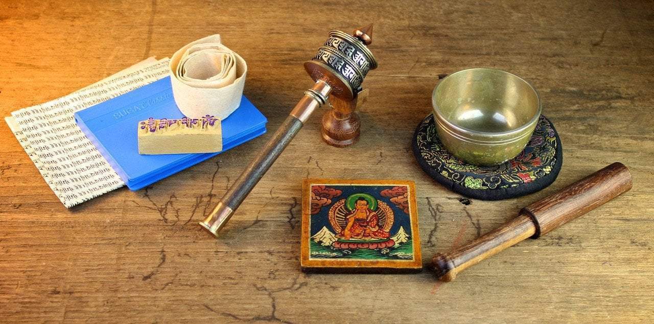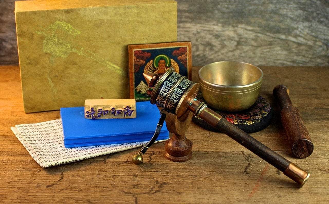 A complete set made just for you! A complete handmade set contained in this beautiful lokta paper box. Your own box contains a prayer wheel that contains prayers, a hand carved prayer wheel stand, a singing bowl with its own striker and hand embroidered cushion, a wooden Buddha picture for your altar, an Om Mani stamp and ink pad as well as prayers for you to use. This box even contains blank lokta paper for you to write your own prayers on.