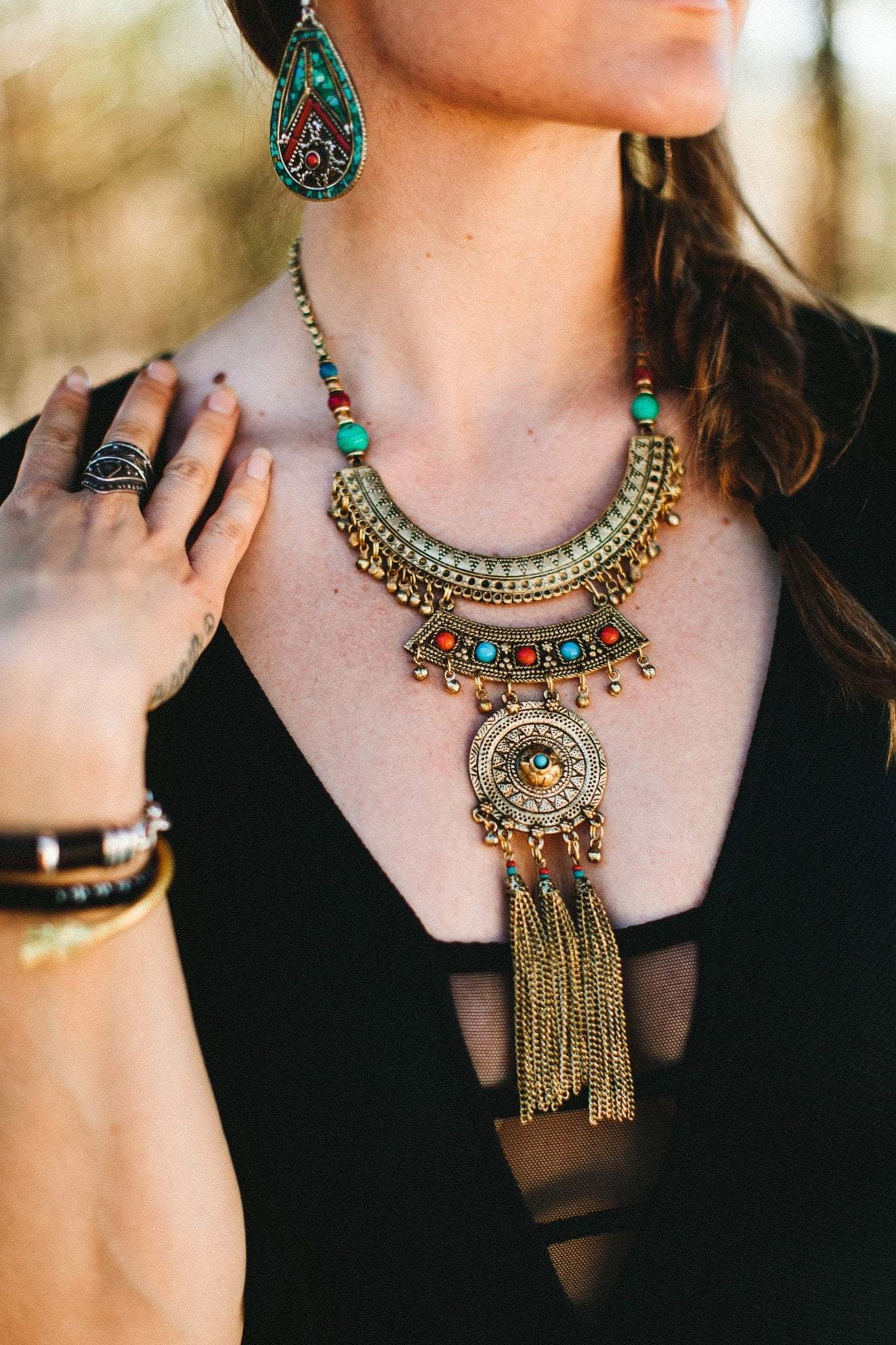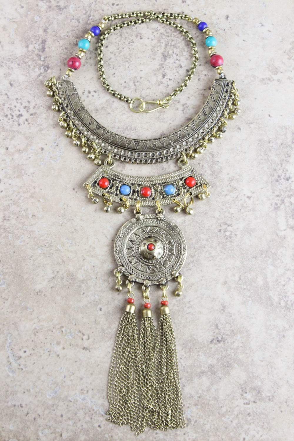 Our new handcrafted necklace from India emphasizes primary colors of blue and red that emerge from beautifully stamped brass. The design gravitates toward a bold circular pendant featuring turquoise and red Sherpa coral.