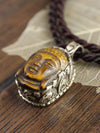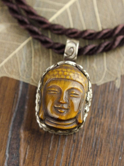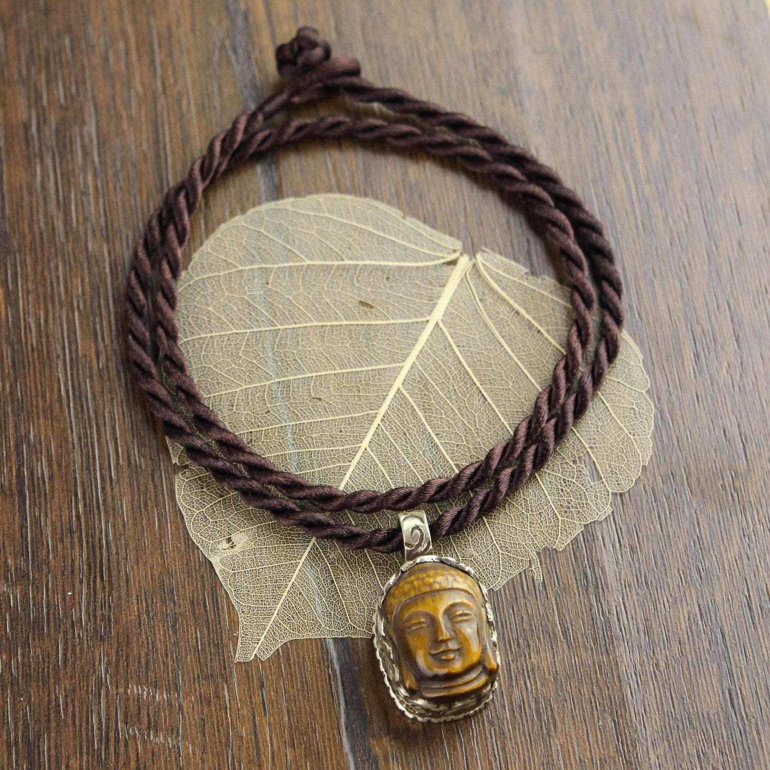 DharmaShop exclusive necklace features a beautiful Buddha pendant made with a hand carved tiger eye gemstone that has been placed into a silver plated setting with intricate hand stamped and etched details. The pendant is hand strung on smooth twist brown nylon cord with satin finish and a knot closure.