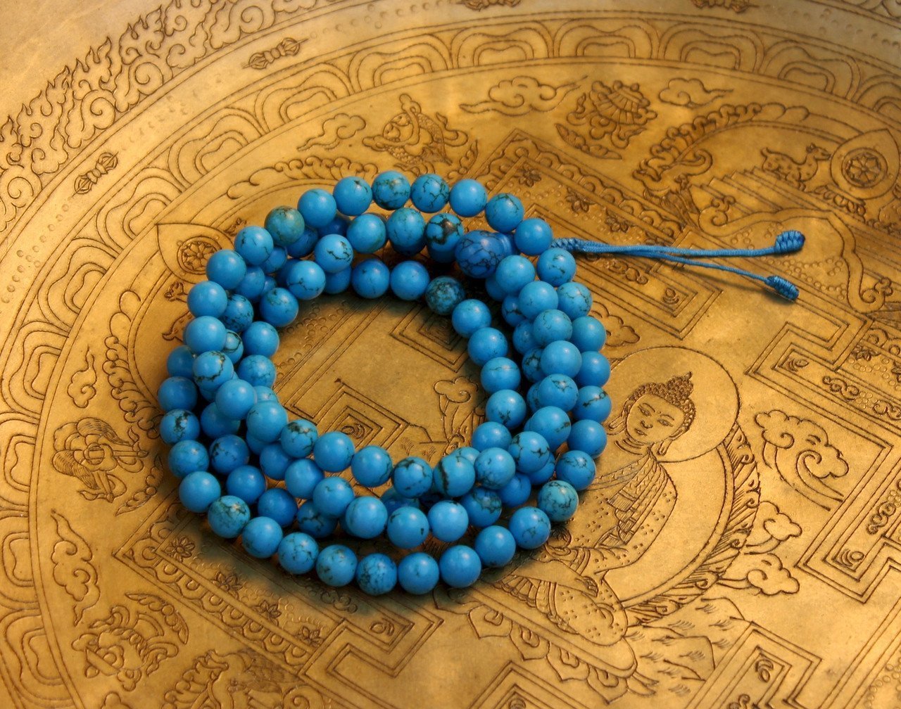 This is the finest quality turquoise we could find anywhere in Nepal. These natural turquoise are bright and vibrant. Each mala is hand made by Tibetan artisans in the USA.