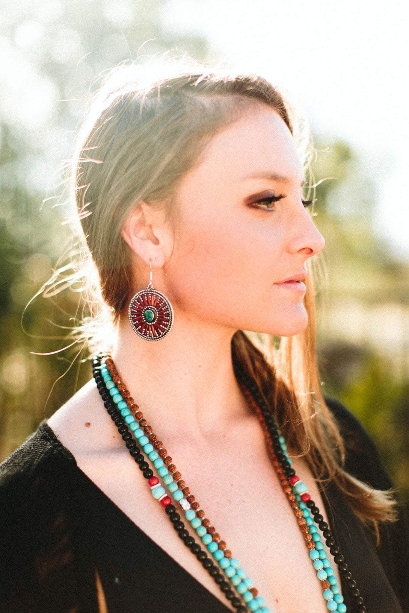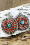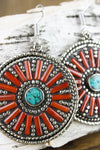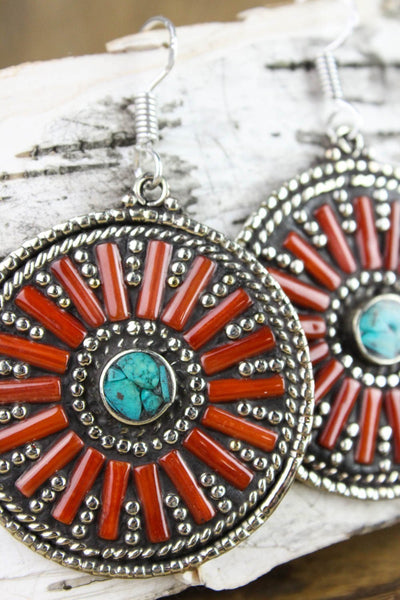 Earrings just in from Nepal. Large earrings are definitely in style this year, but are always in style for Tibetan men and women. These exquisite round earrings feature hand set pieces coral and an inlaid turquoise centerpiece on french hooks. These large and bold earrings are traditional Tibetan style, their radial design looks great when paired with a casual outfit or dressed up.