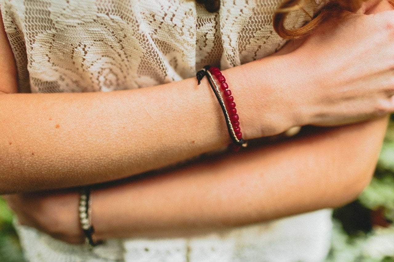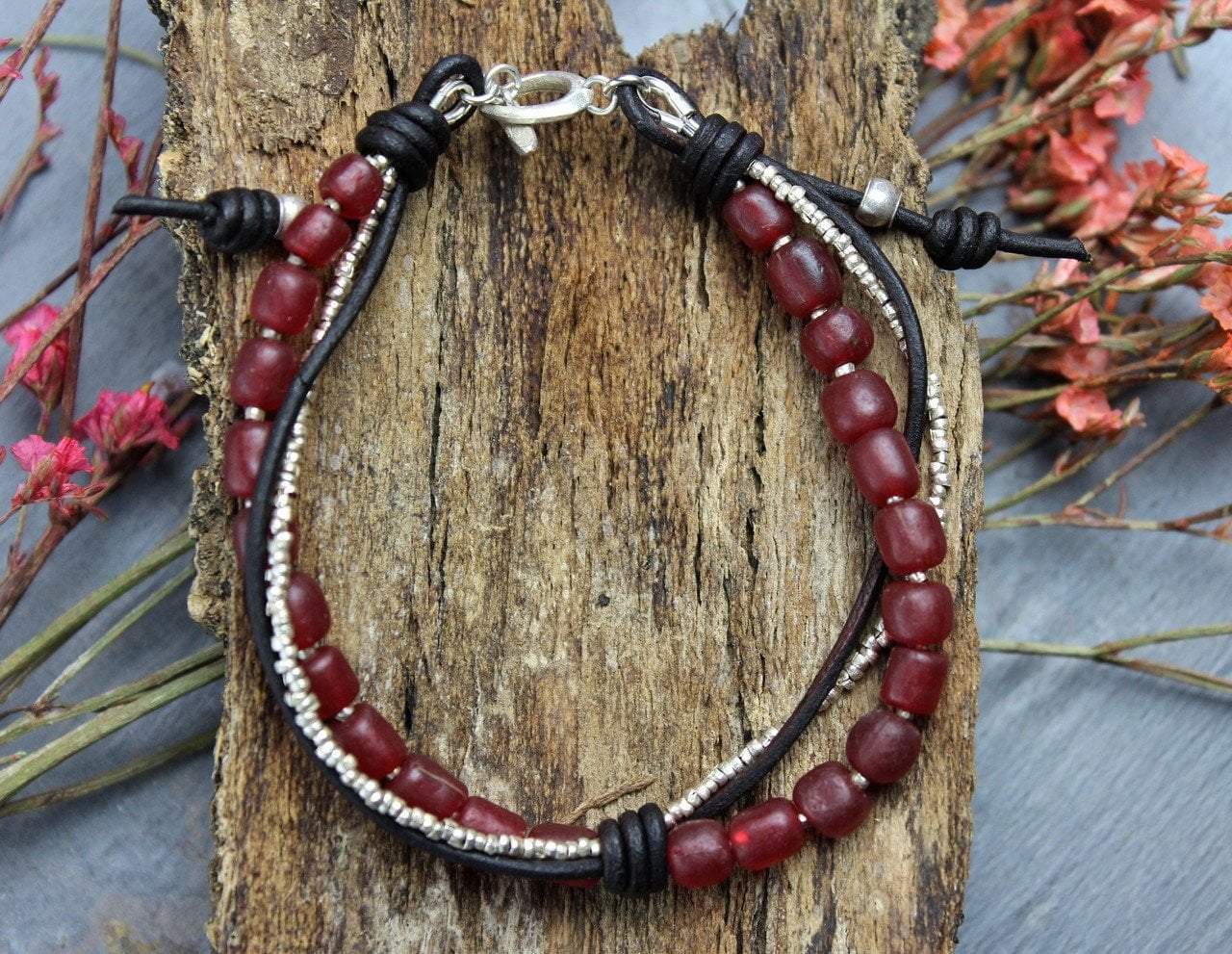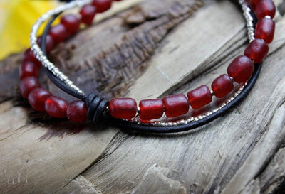 We have an extremely limited quantity of these bracelets! Stunning recycled glass beads are complemented by Thai silver and leather. Sterling silver toggle clasp.