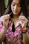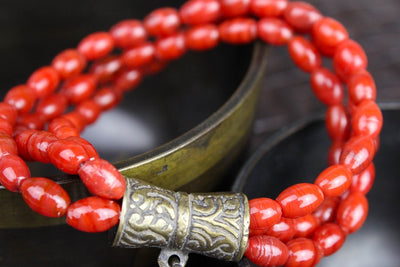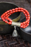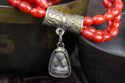 This bracelet includes three strands of beautiful bamboo coral beads on stretchy cord. A gorgeous hand stamped brass bead supports a handmade Thai Amulet that was molded by Buddhist monks and set into its metal frame. Red bamboo coral is used as a protective talisman against evil spirits. It also relieves stress, and stimulates intuition, peace, and emotional healing.