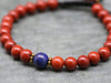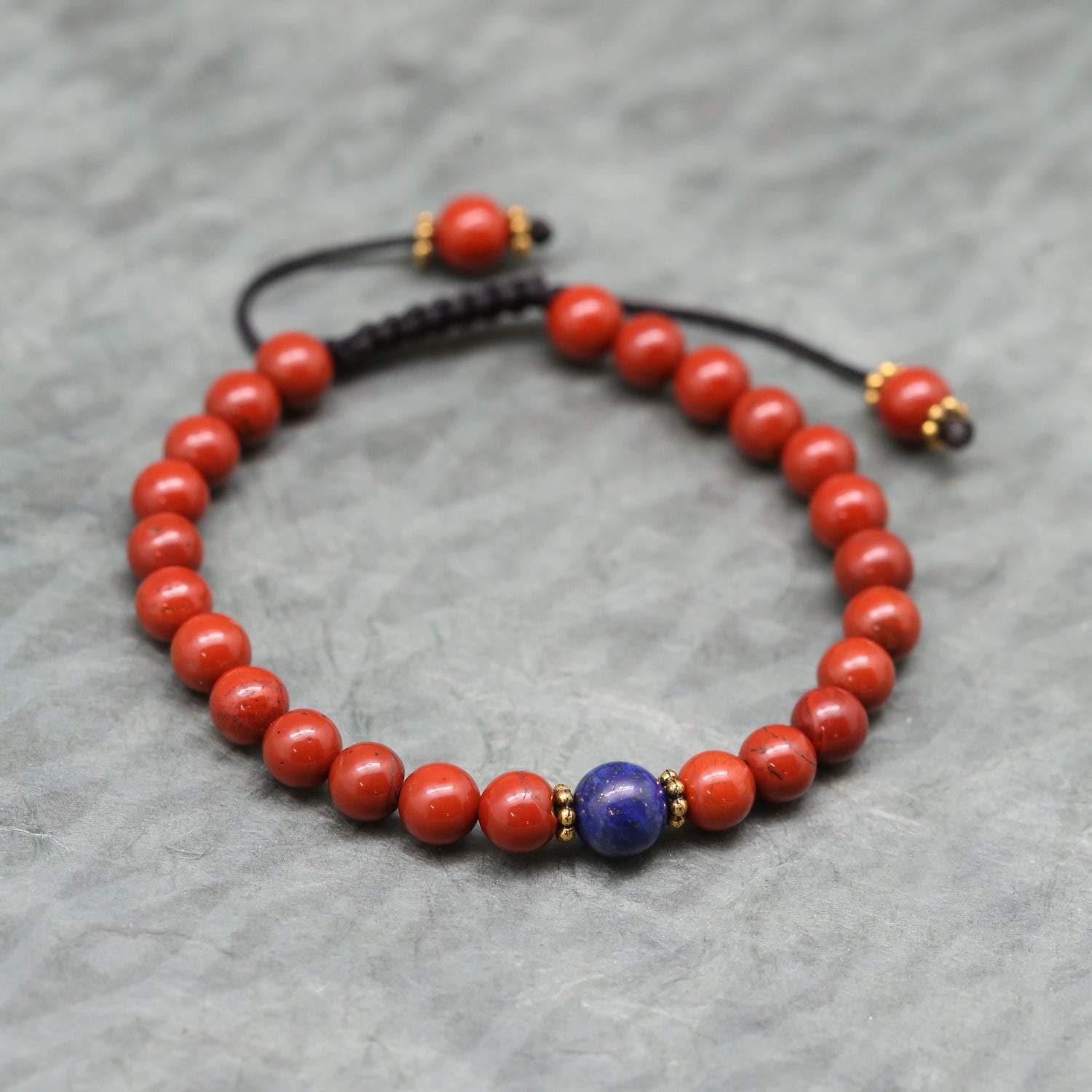 Wrist mala measures approximately 7 inches around when fully tightened and opens to about 10 inches. Red jasper beads are 6mm, lapis bead is 8mm.