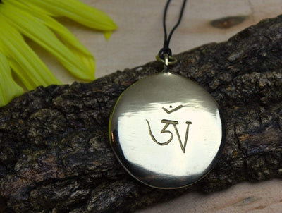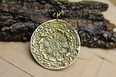 This LARGE brass pendant is reversible. Tibetan Om on one side and an animal mandala-style, very detailed, image on the other.