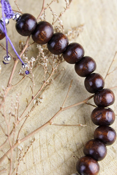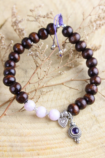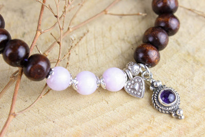 This new and exclusive wrist mala is made up of beautiful Thai rosewood beads accompanied by 3 gorgeous Kunzite stone beads, along with a dainty Hill Tribe 98% pure silver heart shaped charm and spacer bead, and a small Amethyst stone set in a silver dangling charm.