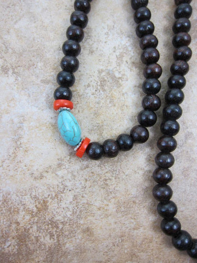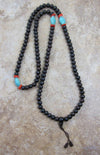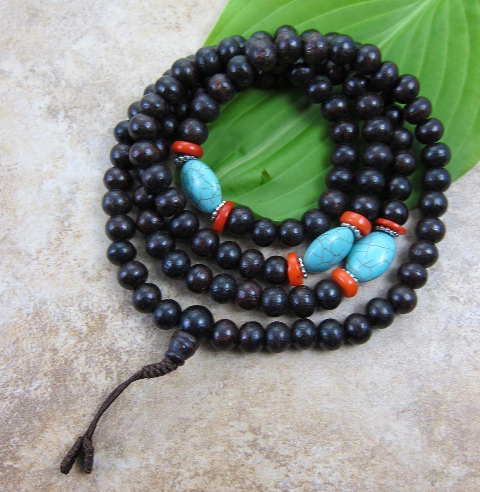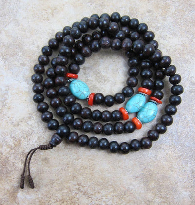 A very nice quality and affordable alternative to bodhi seeds or gemstones.  This rosewood mala is hand strung in Nepal with white heart coral (white coral beads dyed) and pressed turquoise nuggets to create a beautiful and easy to use mala that is just the right size.