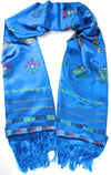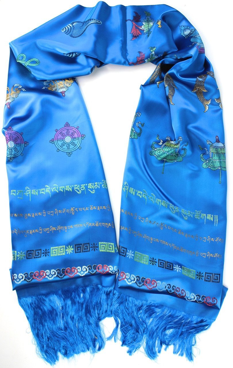 Royal blue embroidered kata from Nepal.  Made out of silk with a soft frayed edge and features a variety of embroidered Buddhist symbols.