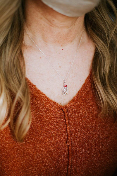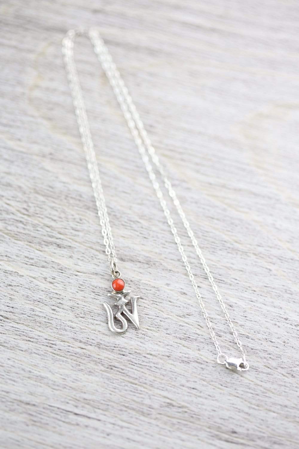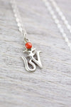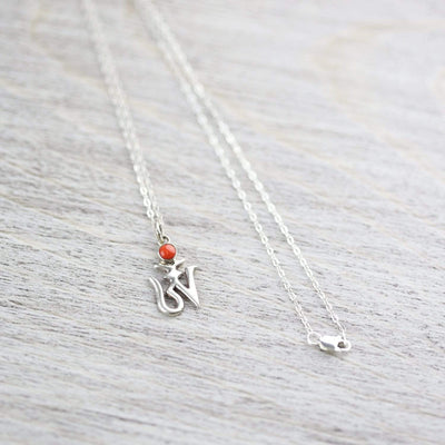 • Pendant features a traditional Om symbol in Tibetan script with an antique coral accent and is strung on a silver flat chain made in the USA.