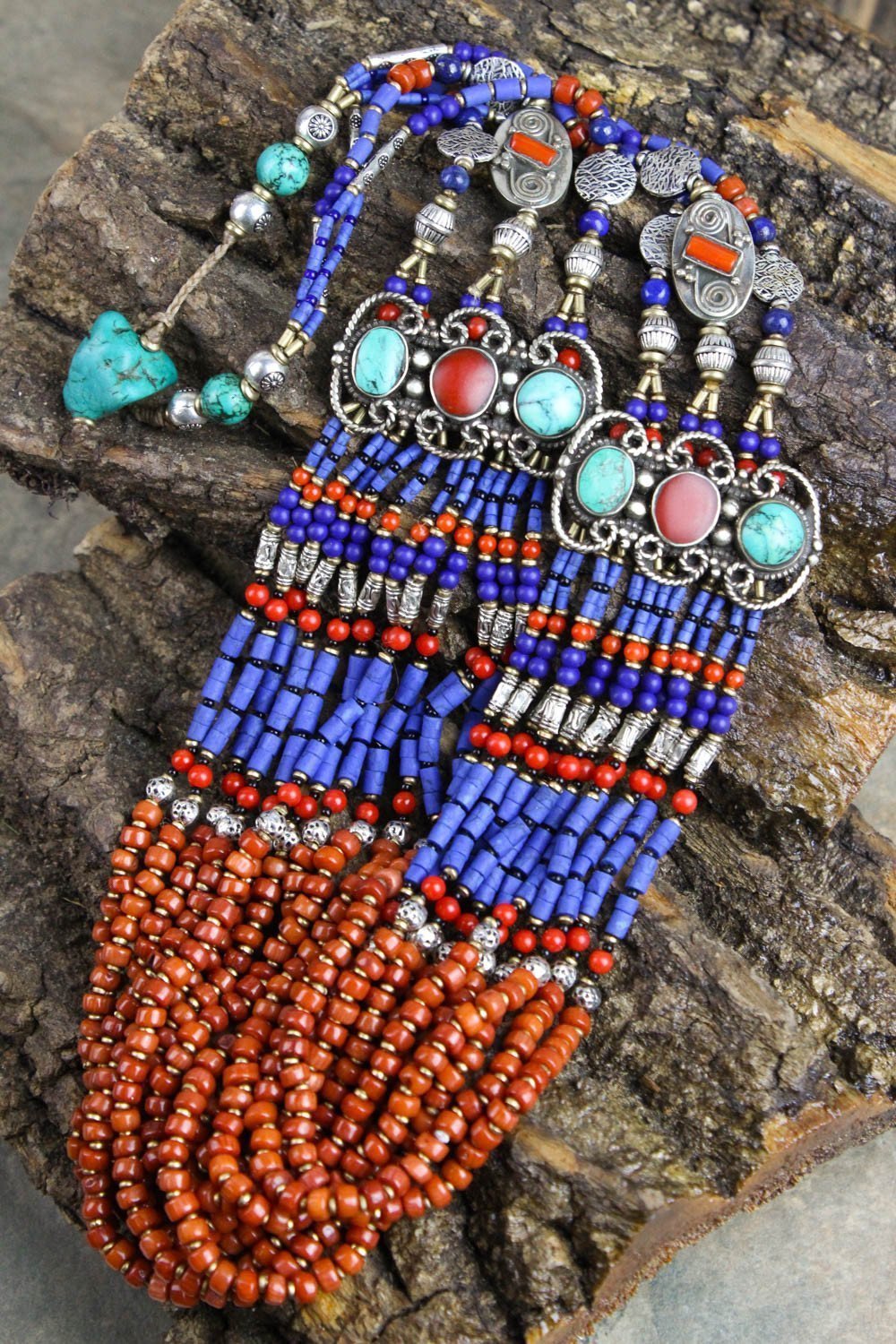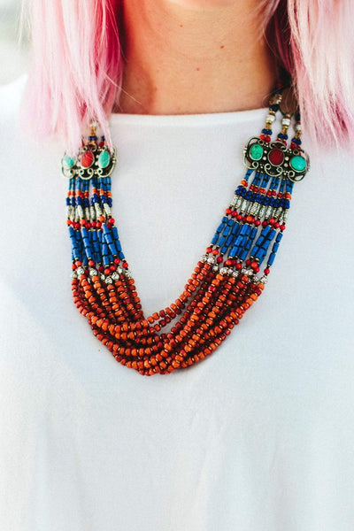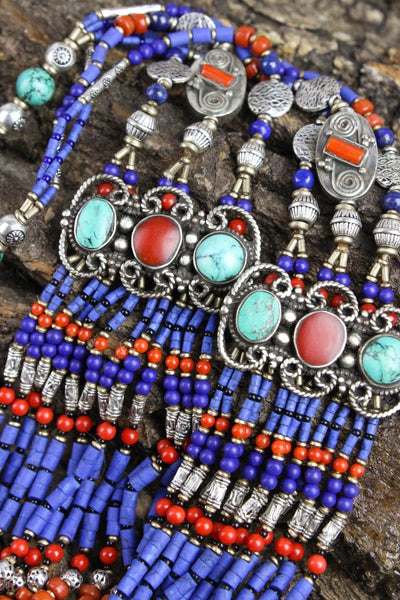 We worked directly with our artists in Nepal to create a range of stunning, one of a kind necklaces that inhabit the spirit of Tibet. Using antique and modern elements, this necklace is a bold and colorful statement piece that will never go out of style. Worn with formal wear or a casual denim shirt, Tibetan jewelry looks almost southwestern to our sensibilities as the design aesthetic is so similar.